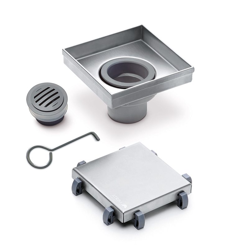 Desagüe cuadrado de acero inoxidable AISI 304. Ofrece dos opciones de tapas en un único producto: Clásica, con un acabado esmerilado y Ceramic, cuyo lado posterior es hueco y permite insertar el revestimiento.