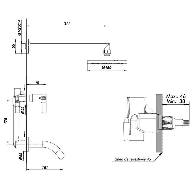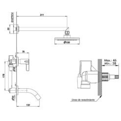 Tipo: Juego para ducha con transferencia (permite derivar el agua entre la flor de ducha y el pico de llenado o una ducha de mano).
