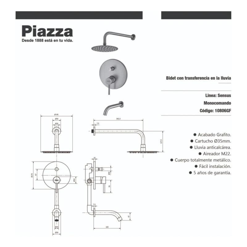 Ducha de embutir con transferencia Sensus Grafito Piazza 10806GF