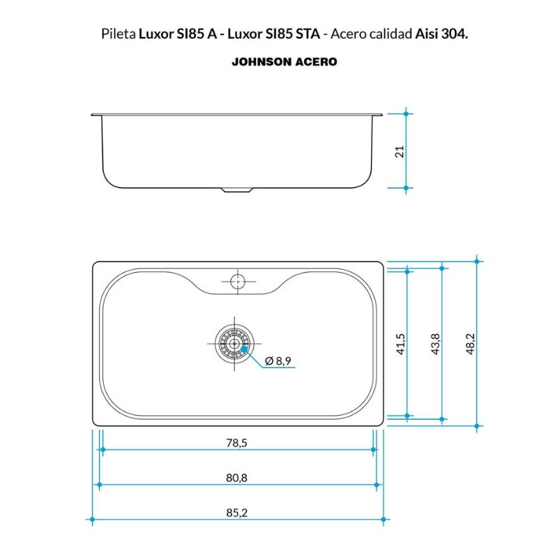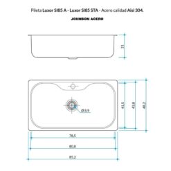La Pileta Johnson Luxor SI85A es el modelo de mayor tamaño dentro de la línea premium Luxor.1 Es la opción ideal para cocinas amplias donde se busca la comodidad de una bacha simple gigante que permite manipular bandejas de horno y ollas de gran tamaño con total libertad.2+1A diferencia del modelo SI71A (que mide 71 cm), esta versión extiende su largo hasta los 85,5 cm.3Ficha TécnicaMedidas: 4$85,5 times 48,2 times 21$ cm.5Material: Acero Inoxidable AISI 304 (Espesor superior y alta resistencia).6Capacidad: 42 a 55 litros (según el nivel de llenado útil).Configuración (1Perf+D/D):1 Perf: Orificio central para grifería monocomando.D/D: Orificio lateral para el dosificador de detergente (incluido)