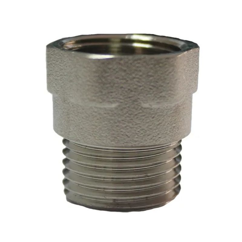 El objeto mostrado tiene una rosca macho en un extremo y una rosca hembra en el otro, lo que permite extender la longitud de una conexión o adaptar un accesorio a una tubería.
